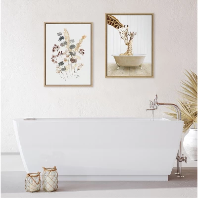 Bring some extra love to bath time with this super cute animal print for your bathroom, mudroom or laundry room. Showcasing a mothers love for her baby, this mama and baby giraffe are sure to make you smile. Framed in the USA in Waunakee, Wisconsin, this floating canvas art will be a pleasure to look at every day in your living room, bedroom, home office, laundry room, bathroom, or any room in the home. This art print also makes an excellent gift for birthdays, holidays, or house-warming parties. Printed on gallery-wrapped canvas and framed with a lightweight polystyrene frame, this wall art is easy to display on the wall. The outer dimensions are 18 inches by 24 inches by 1.6 inches. Print Name: “Mother and Baby Giraffe Farmhouse Bath”