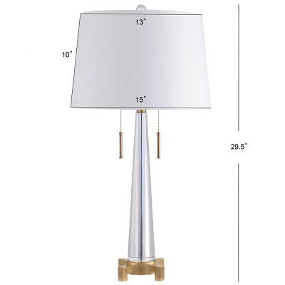 Sophisticated and sleek in a smooth tapered crystal, this table lamp features a cone-shaped base and white linen drum shade. With brass accents including a cistern-style base and double pull chains, this lamp would look gorgeous on a bedside table or in a living area. You’ll love the silk-wrapped cord, which is almost too lovely to conceal and the fact that it takes two bulbs — so you can control the level of light it emits.