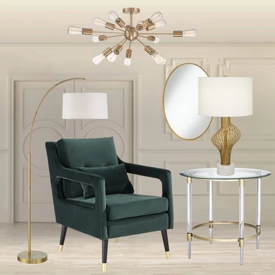 From the 360 Lighting brand, this elegant arc floor lamp offers contemporary styling for your home. It features a widely arching frame in a lovely brass finish and a white linen drum shade on top, resulting in a sleek modern look. A great upgrade for seating areas and living rooms, this floor lamp is great for reading task lighting.