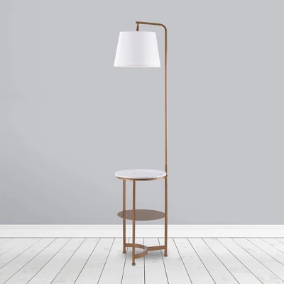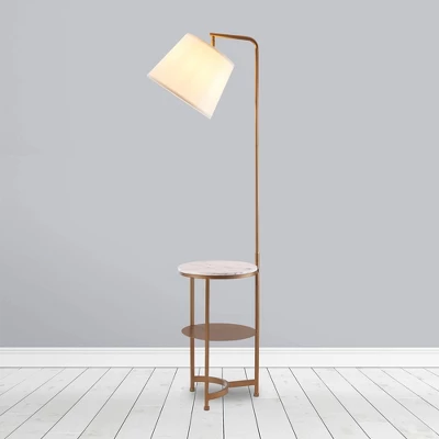 Illuminate your space while adding a functional surface with the Teamson Home Taelyn Floor Lamp End Table with Storage Shelf and Built-In USB. This table and lamp combination features a metal base with a gold finish, a white drum shade, and a faux marble tabletop for a modern addition to your bedroom or living space. This side table also includes a built-in USB port right next to the lamp to keep your devices charged and within reach. With a storage shelf under the tabletop, this table provides plenty of space for your phone, remotes, books, and other small items. Constructed from durable materials, this lamp is built for long-lasting use. Purchase this table and lamp alone or with a high-quality Teamson accent chair to complete your reading nook. For easy assembly, step-by-step instructions are included. The Teamson Home Taelyn Floor Lamp End Table with Storage Shelf and Built-In USB measures 14″ x 14″ x 64″ to fit easily into most spaces. Lightbulb not included.