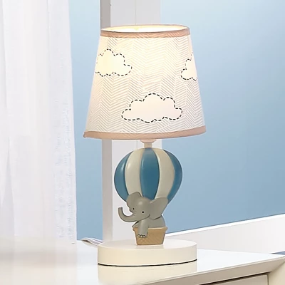 Light up your child’s room with a soft glow with this custom hot air balloon lamp and shade. It is made of a 2-dimensional resin, is hand painted and the total height is approximately 11”. The wide stripe hot air balloon is carrying a cute gray elephant in the basket. The lamp shade is sky blue with white clouds. This lamp comes complete with an energy-efficient LED light bulb equivalent to 40 watts.