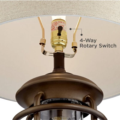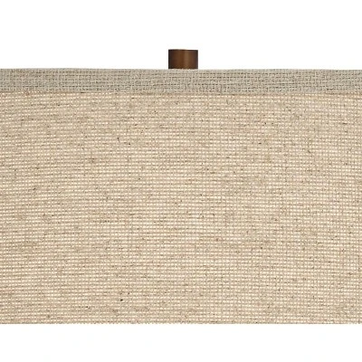 - Lantern style base. Metal construction. Clear glass. Oatmeal fabric shade. 8-foot long brown cord.