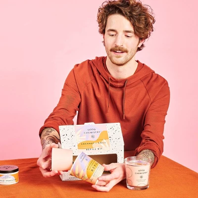 The Good Chemistry Coconut and Chill Refillable Glass Candle and Biodegradable Candle Refill are a dreamy isle vibe wrapped in cool, creamy coconut. With notes of citrus zest, coconut, Tonka bean, and vanilla, the Plant-Based Coconut and Chill Scented Candle Kit is designed to refill our glass candles again and again for a consistent and delightful home fragrance.