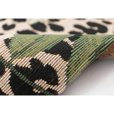 Design favorite leopard print is paired with tropical leaves to create an unexpected combination that is modern, fresh and bold. The perfect leopard print in beige and black is accented by detailed green tropical leaves to evoke a sense of nature. This decorative area rug will be a glamorous addition to any space inside or outside your home. Made in Egypt from 75% polypropylene/25% polyester, the Marina Collection is Power Loomed to create intricate designs with a broad color spectrum and a high-quality finish. The material is flatwoven, low profile, weather resistant, UV stabilized for enhanced fade resistance, durable and ideal for those high traffic areas such as your patio, sunroom, kitchen, entryway, hallway, living room and bedroom making this the ideal indoor or outdoor rug. Detailed patterns are offered in an eclectic mix of styles ranging from tropical, coastal, geometric, contemporary and traditional designs; making these perfect accent rugs for your home. Limiting exposure to rain, moisture and direct sun will prolong rug life.