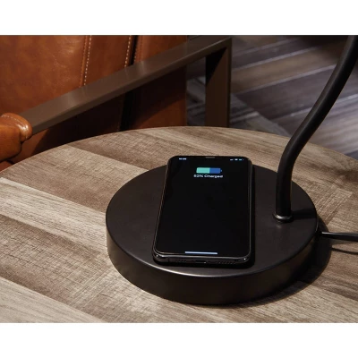 Donāt let lighting throw you for a loop. The beautiful curve of this lamp will add the right contour to your space. With a classic black finish, the arc of this lamp ends with an adjustable metal shade. The integrated wireless charging and USB port add a convenient way to keep your devices powered. Black finished desk lamp. Metal shade. Adjustable neck. (1) Wireless charger and (1) USB charging port. On/off switch. (1) E26 socket, type G bulb recommended – 40 watts max or 8 watts max CFL. Matching floor lamp -L206001. Signature Design by Ashley is a registered trademark of Ashley Furniture Industries, Inc.