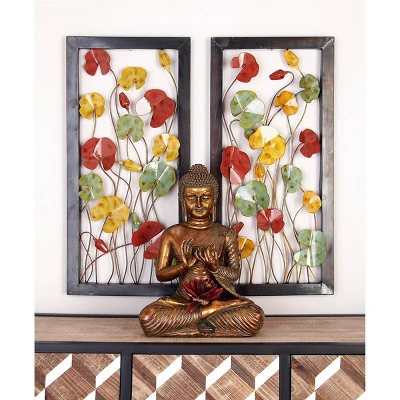 This metal wall plaque set and its multicolored display will stand out in your traditional style inspired living space when displayed on empty walls. This item ships in 1 carton. Can be hung vertically using the keyholes on the back; nails and screws not included. Suitable for indoor use only. This item ships fully assembled in one piece. This multi colored wall sculptures comes as a set of 2. Traditional style.