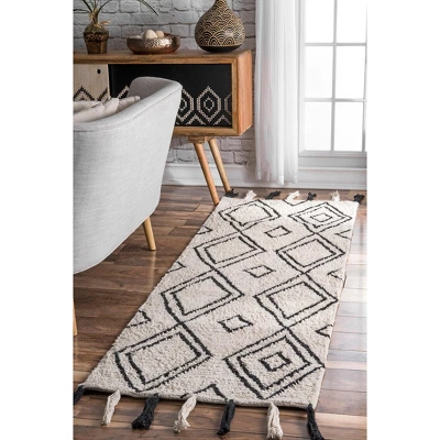 Decorate your home with this diamond patterned tassel shag rug. This Moroccan-inspired area rug is made wholly of wool, complete with a charming, modern geometric layout worthy of nearly any theme. The soft, plush area rug was meticulously hand- crafted to create softness underfoot. A rug pad is recommended to prevent slipping and to keep the rug lying flat in one place.