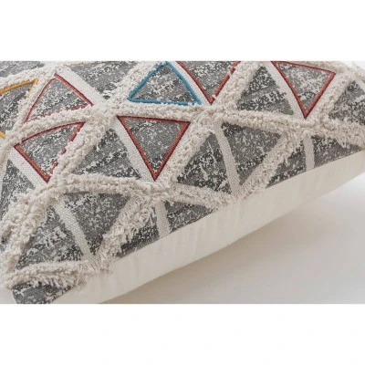 Use the chic, geometric look of this throw pillow to enhance the style of any decor. Its gray triangular print is printed on a natural cotton ground creating a modern vibe with fringed detailing that adds dimension and texture. Pops of color outlining the triangles are printed and appliqued in rich colors of orange, yellow and blue. Additional features include a knife edge seam for a clean finish and recycled polyester fiber fill with a sewn seam closure.