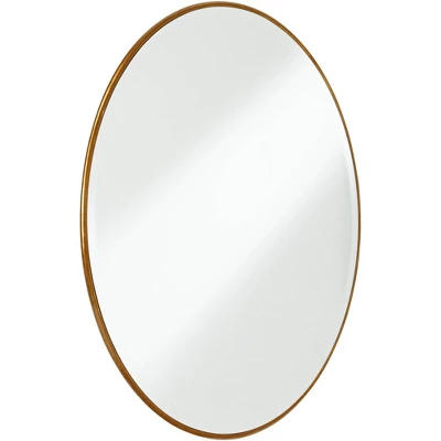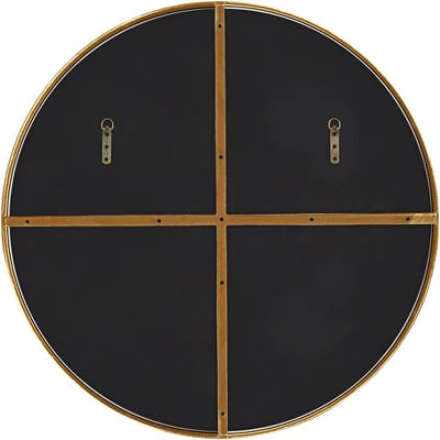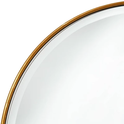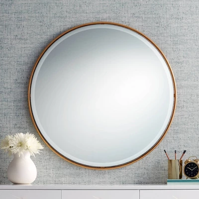 Brought to you by Uttermost, this elegantly understated and chic round mirror boasts a beautiful shiny antiqued gold leaf finish across its slim iron frame. The beveled glass mirror keeps a timeless appeal and a transitional aesthetic that works with countless styles. Along the back is D-ring hanging hardware, making mounting to walls a breeze.