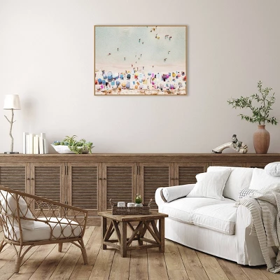 ART DESCRIPTION: Bright beach umbrellas line up in the sand while intrepid waders splash into the crystal clear waters. A rippling wind brings a much needed breath of fresh air to this summer day. This Amanti Art canvas art print was created by Krista Broadway and printed by Amanti Art in Madison WI. The canvas is stretched by hand and finished with a float frame. Individually made using traditional custom framing techniques, it has the quality you would expect from your local frame shop. Because of our attention to detail and focus on artistry, architects, interior designers, and homeowners alike choose this framed canvas artwork to create beautiful living spaces.